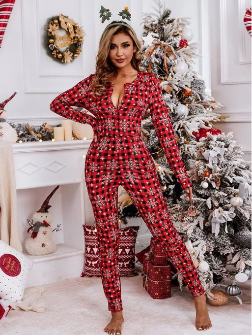 Christmas pijama Plaid Functional Buttoned Adults Pajamas Long Sleeve Jumpsuit Lowcut V Neck Onesie
